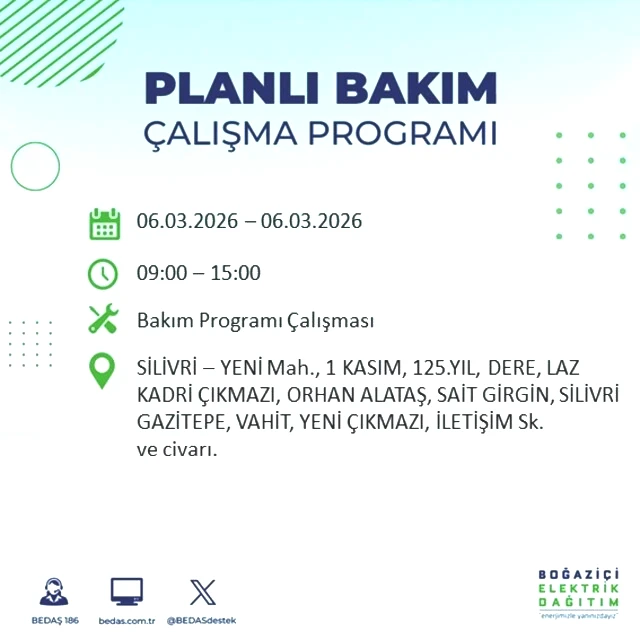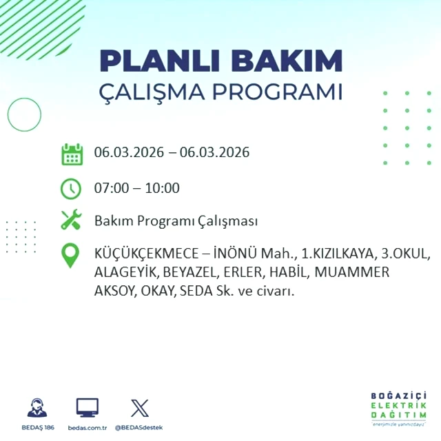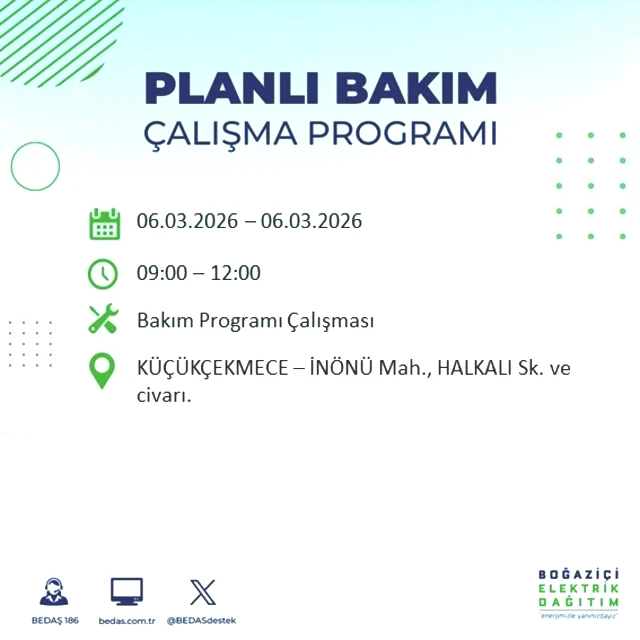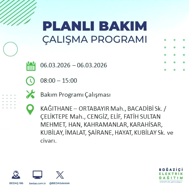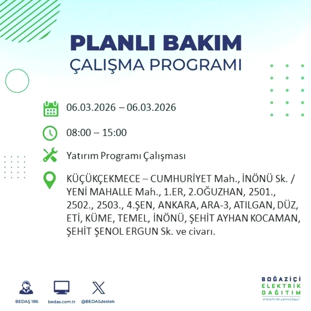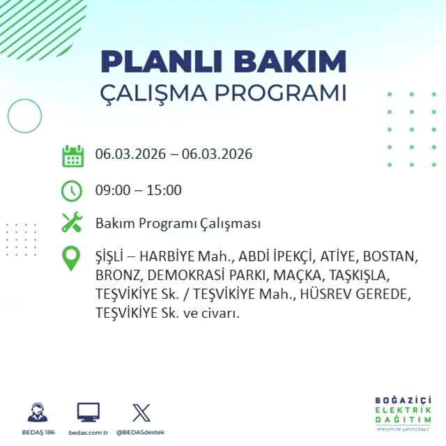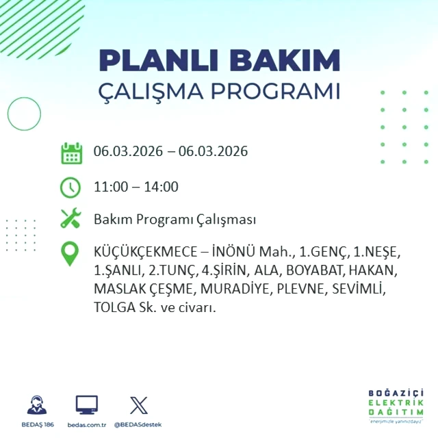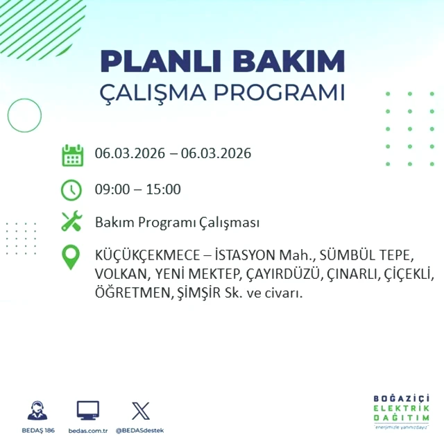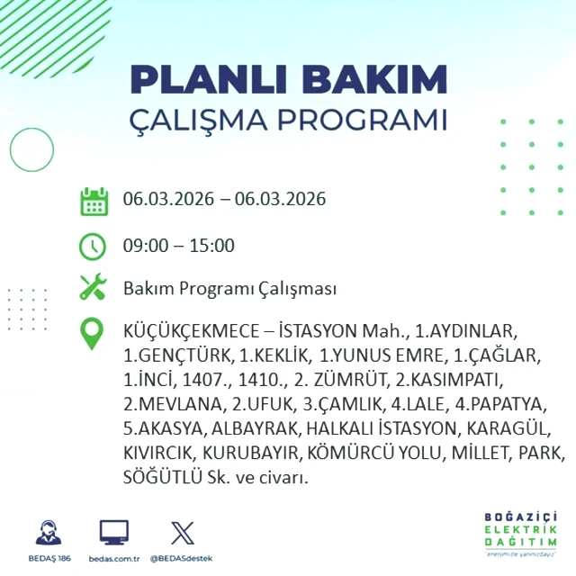 Megakentte yaklaşan hafta sonu için elektrik kesintisi uyarısı yapıldı. 6 Mart 2026 tarihinde İstanbul genelinde yapılacak olan bakım ve altyapı düzenlemeleri nedeniyle 25 ilçede toplamda 72 ayrı noktada planlı elektrik kesintileri söz konusu. Beşiktaş, Sarıyer, Küçükçekmece ve Sultanbeyli gibi birçok ilçede kesintiler, gün boyunca farklı saat dilimlerinde gerçekleştirilecek. İşte bu planlı elektrik kesintileriyle ilgili detaylar...