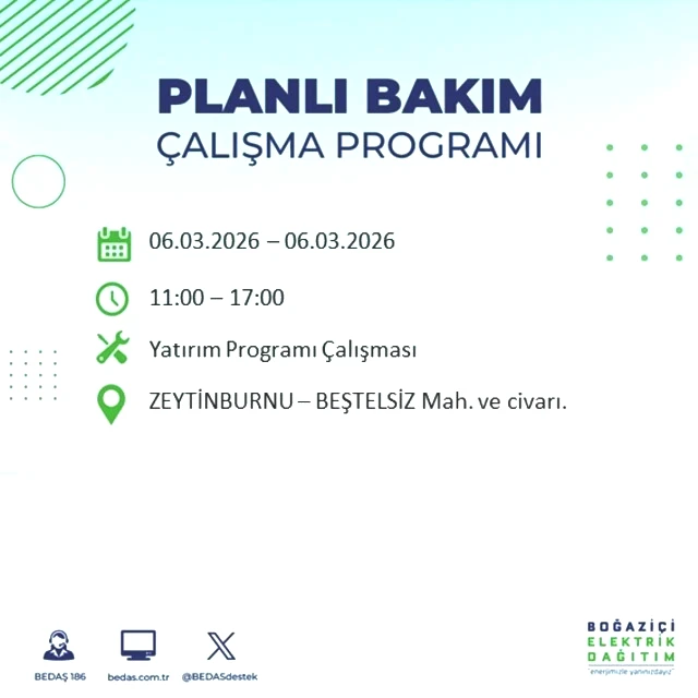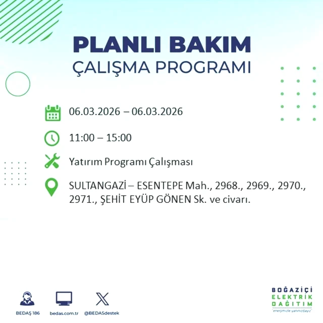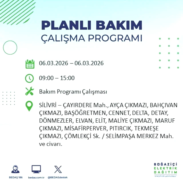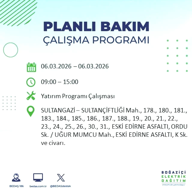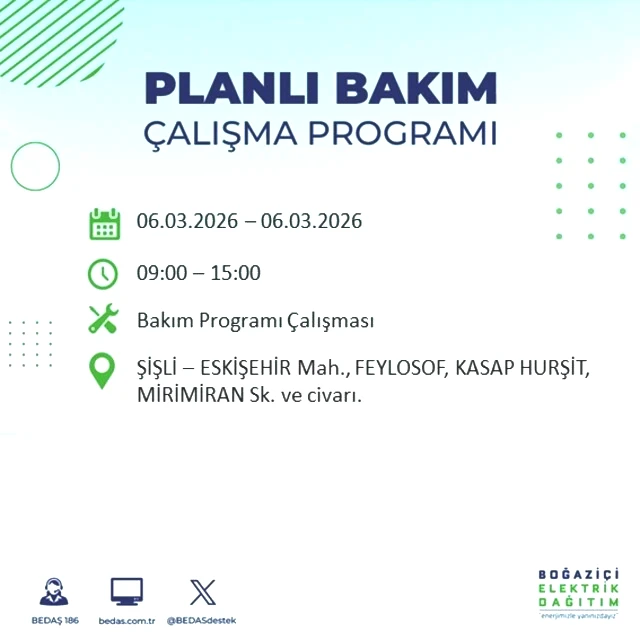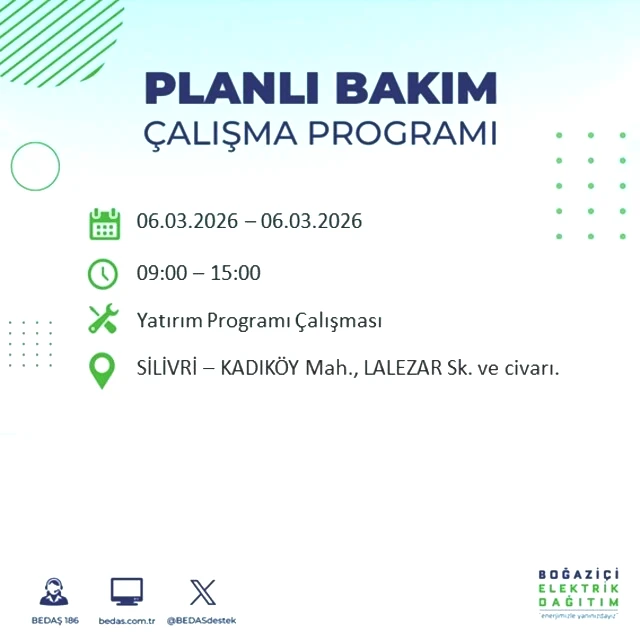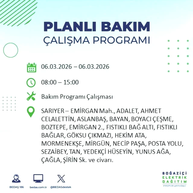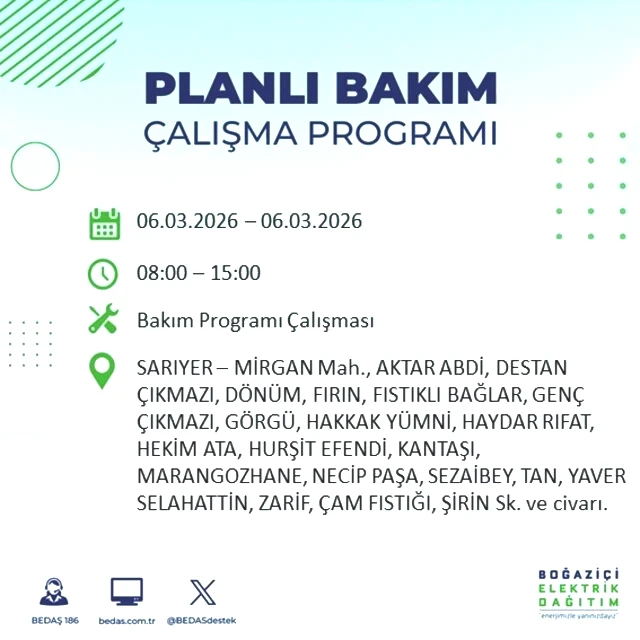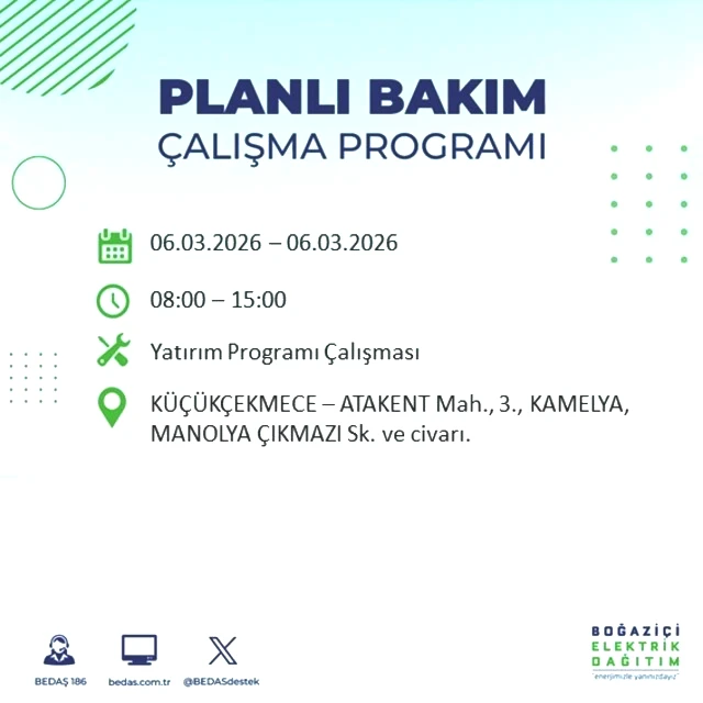 Megakentte yaklaşan hafta sonu için elektrik kesintisi uyarısı yapıldı. 6 Mart 2026 tarihinde İstanbul genelinde yapılacak olan bakım ve altyapı düzenlemeleri nedeniyle 25 ilçede toplamda 72 ayrı noktada planlı elektrik kesintileri söz konusu. Beşiktaş, Sarıyer, Küçükçekmece ve Sultanbeyli gibi birçok ilçede kesintiler, gün boyunca farklı saat dilimlerinde gerçekleştirilecek. İşte bu planlı elektrik kesintileriyle ilgili detaylar...